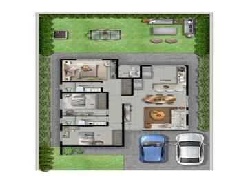 Casa térrea com 3 dormitórios sendo 1 suíte com espaço para closet, sala de jantar e estar integradas a cozinha, banheiro social e lavanderia coberta.